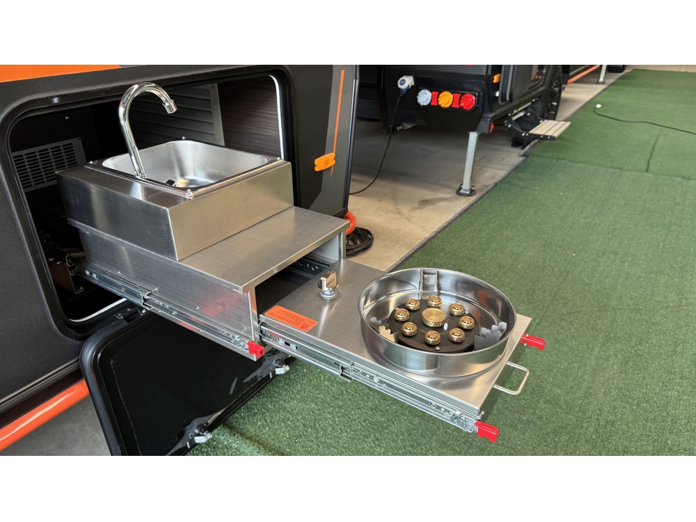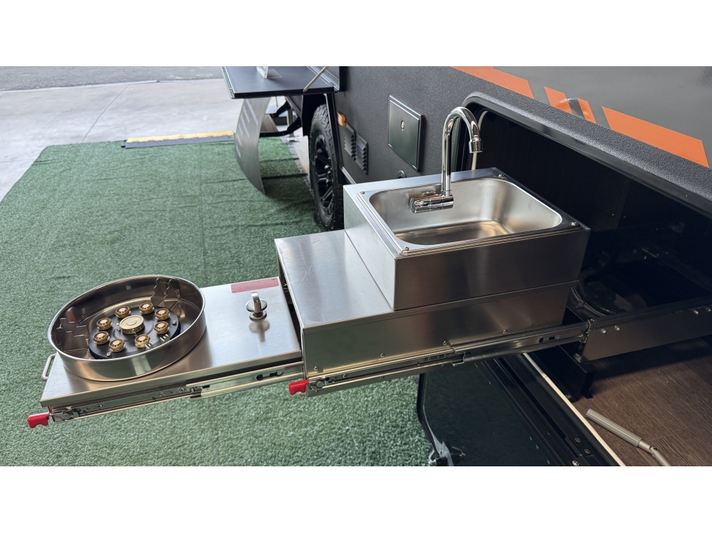 Cozinha externa com fogão uma boca e uma pia com cuba em aço inox