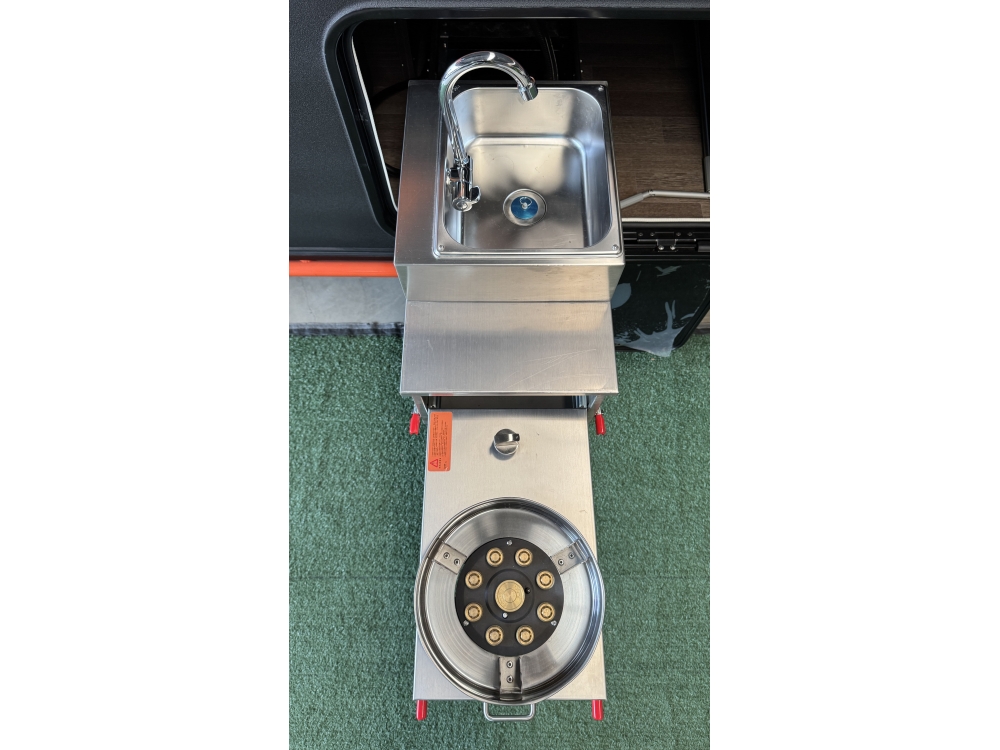 Mini-combinado, com tampa de vidro, em aço inox com fogão de 02 bocas e pia com cuba.
